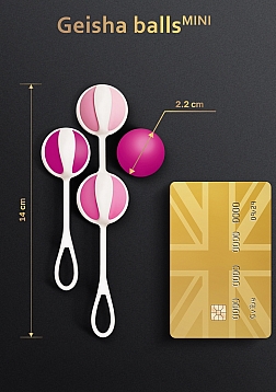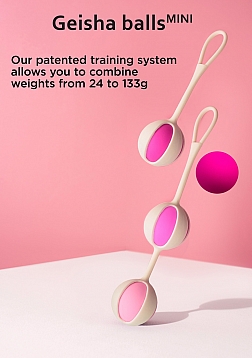 Geisha Balls Mini are made of ABS plastic, a safe, hypoallergenic and non-porous material that is easy to clean and easy to store. The string is made of soft medical grade silicone. Be sure to wash the balls with toy cleaner before the first use and after each workout. For exercise, be sure to use a water-based lubricant.