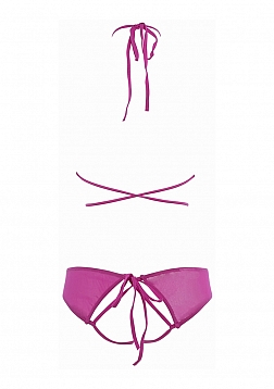 This set is mix of Sporty & Spice, with the classic halter barely covering your assets and circling the under bust & waist for maximum drama. Fully open panty with strappy lace up back. What more could you dream of?