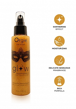 Orgie Glow Shimmerring Body Oil is a lightweight moisturizing oil with delicate sensuous fragrance that highlights areas of the sking where applied. Neck, cleavage, shoulder, arms, thighs, legs, or full body! Formulated with the rich combination of Sunflower Seed Oil, Sweet Almond Oil, Olive Oil, and Grape Seed Oil. Moisturize and enhance the beauty of your skin leaving it with a satin touch and a glamorous golden glow. Let's put beauty to shine!