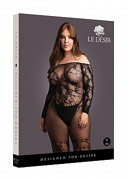 Stunning off-shoulder longsleeve bodystocking with open crotch. Combo fishnet and lace pattern contours the body and stockings. The soft super stretchy fabric will fit sizes XL to 4XL.