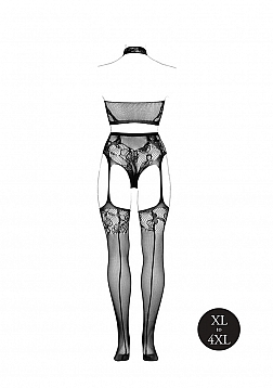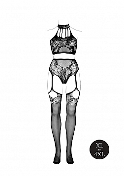Halter turtleneck two-piece with pantie and attached stockings. Stunning combo of lace pattern and fishnet, accentuating the body. The soft super stretchy fabric will fit sizes XL to 4XL.