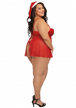 Plus Size Stretch velvet Santa babydoll & thong set featuring: underwire push-up cups with faux-fur neckline detail, bow with pom-poms, stretch mesh skirt with ribbon hem, side-tie velvet thong, matching Santa hat included.