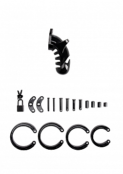The Man|Cage Chastity Cages are manufactured from high-grade polycarbonate, a very light, durable and hypoallergenic material. The cage consists of three parts which fit perfectly together. The two guidance pins connect the top parts and the oval taper pin connects the rings with the cage. A variety of rings in different sizes and distance pieces will allow you to create the perfect size! The rings have a comfortable fit and are absolutely safe. A metal lock or tie-wrap lock can easily close the cage. The included tie-wrap locks ensure that they will not trigger the alarm of metal detectors at parties, festivals or even airports! As hygiene is very important while wearing a cage, the superior Man|Cage series are equipped with a variety of vents and a urination opening. The cage makes it impossible to get an erection but it will be, after liberation, super intense, just like the freeing orgasm to follow! The Man|Cage Chastity Cage gives the key-holder optimal power over sexual gratification!