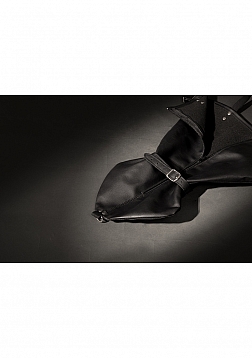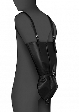 Step into the world of intense BDSM with this Full Sleeve Armbinder. This PU leather armbinder takes away all freedom of movement, tightly binding the arms behind the back with its sleek black harness. Secured over the shoulders, it offers full adjustability for a good fit. The buckles feature small round openings, providing the option to add a padlock, giving you ultimate control over your submissive. The D-ring at the end adds an extra level of kinkiness, allowing you to attach ropes, chains, or ankle cuffs.