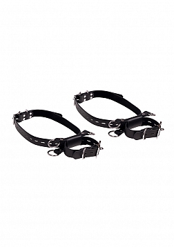With this Kneeling Thigh Cuff Set, you can access your lover's body and intimate areas when you secure these cuffs around their thighs and ankles, effortlessly opening their legs for exploration. Have them on their knees for mind-blowing oral sex or position them on their belly to indulge in some booty play. The set includes four O-rings for attaching additional accessories like wrist restraints, and metal buckles that can be locked with a padlock, allowing you to fully control. Can also be used as a wrist-to-thigh restraint system.