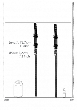 | Dimensions package | 9 x 5 x 16,50 cm | | Weight package | 372 gram | | Product dimensions | 78,7 x 3,2 x 2,3 cm | | Product weight | 338 gram | | Splashproof | Yes | | Phthalate free | Yes | | Specifications | The ankle/handcuffs have 10 holes to adjust the length. The thigh cuffs have 20 holes to adjust the length. | | Materials | 80% PU leather, 20% Metal |