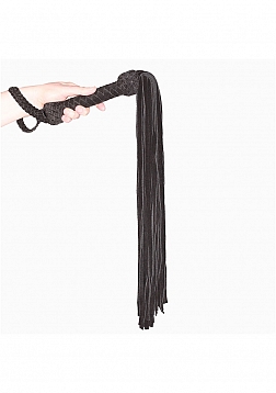 Prowler RED Leather Suede Flogger Black. The Prowler RED Leather Suede Flogger in black is a hand-held whip with a suede-wrapped handle and a weighted end. It has long tasseled suede strands that tangle when they land on the skin. The flogger is ideal for those that want to add new and exciting pieces to their fetish collection.