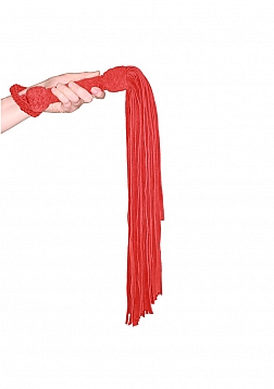 Prowler RED Leather Suede Flogger Red. The Prowler RED Leather Suede Flogger in red is a hand-held whip with a suede-wrapped handle and a weighted end. It has long tasseled suede strands that tangle when they land on the skin. The flogger is ideal for those that want to add new and exciting pieces to their fetish collection.