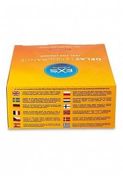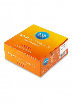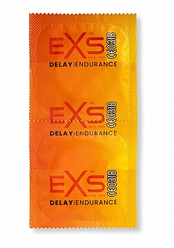 Natural latex, teat ended, and silicone lubricated condom. EXS Endurance Delay condoms are 53 mm straight walled and made of natural latex. Each condom is lubricated on the outside (although extra lube maybe required) and have a 1% Lidocaine anaesthetic lube on the inside which should be massaged into the head of the penis. EXS Endurance Delay condoms make you last longer during love making!