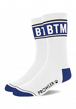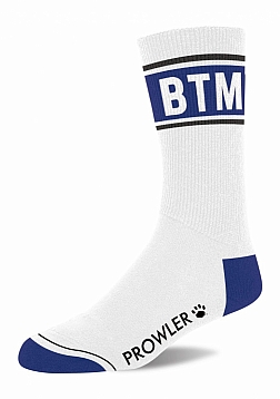 These Prowler BTM socks are the perfect way to proclaim your love of being a bottom. They feature a classic white color and blue band, heel and toes while featuring the Prowler logo along the bottom of each sock. Wear them with anything and you'll be sure to stay comfortable all day long. Pull on these classic white Prowler BTM socks for an extra boost of sexy, sporty style. This pair of comfy white socks will look great when worn with anything or nothing at all!