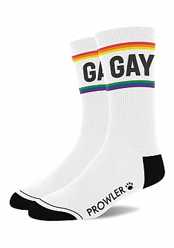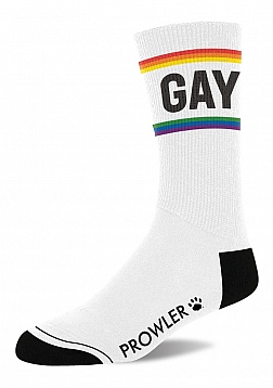 These Prowler  socks are a great way to show off your support of the LGBT community and have some fun while doing it. True to the brand, these bad boys feature rainbow stripes along the band and black colored toes and heel, all while letting the world know where you stand with the word Gay displayed across the sock band. These Prowler socks are perfect for any occasion and can be worn with anything.