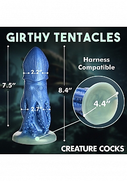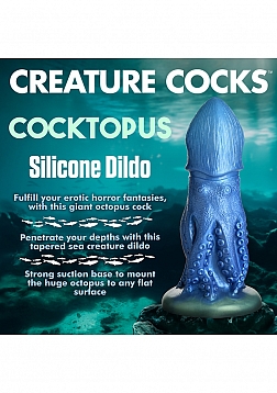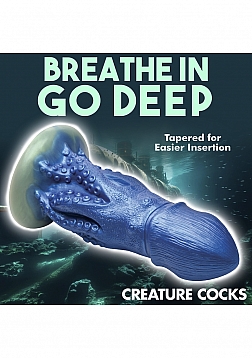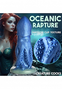 Deep from the ocean depths comes a creature that has come for dark caves and warmer waters. This iridescent blue octopus has eyes on the side of its head, eight tentacles with textured suckes on them, and a bulbous head that has a tapered tip. Take a deep breath and go deep with this girthy dong. Squishy and soft on the outside, it's firm on the inside and is going to fit to your form as you let it slip inside and penetrate you. Made out of premium, phthalate-free silicone, it is body-safe to use with water-based lubricants. The suction up base can be placed on any flat surface for a hands free ocean exploration. Combine it with a strapon harness for couples fantasy roleplay. Include it in kinky cosplay or indulge in hentai tentacle fetish fantasies as you dream of the Fisherman's Wife and her Octopus lover and stretch your limits while slowly sliding this inside! Use it solo or with your partner to spice up your sex life! After use, wash with warm water and mild soap, then spray with a toy cleaner and wipe dry. Keep out of direct sunlight. Store in a cool, dark place. You're floating in the open water. It's a hot day and no one is around. Your friends are sleeping through the morning after a long night of partying on the boat, so you decided to take a dip in the cool waters. Goggles on your face, you take a deep breath and dive deeper. Scanning the depths for fish, something catches your eye. It darts across your field of vision and disappears. What was that? Was it a fish? Was it a shark? Something touches your leg and you panic, swimming quickly up to gasp for air. You calm your breath and then take another deep breath and dunk your head underwater again to look for what it could've been. Your eyes widen as you see a shimmering, blue octopus floating nearby. Its eyes are watching you. Its tentacles slowly float as its large round head expands into a bulb. You're transfixed, enchanted by this rare meeting. It floats closer to you and then, to your utter shock, it reaches its tentacles and winds it around your wrist. You hold still, your heart racing as you feel the suckers tasting your skin. The other tentacle reaches for your waist, then another reaches towards your inner thighs. What is this tingling feeling? Before you can move it releases you and darts between your legs. In confusion you rise up with your head above the water, but you feel the head of the octopus creature writhing against your groin. You want to make it stop, but its head is slippery and its tentacles are strong. Then you gasp as unimaginable pleasure spreads through you as the tip begins to part your hole, the ultra slippery octopus slipping insideĀ