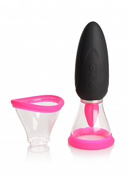 Indulge in pumping, licking and vibration like never before! This mini suction toy comes with 2 different sized cups that fit either the clitoris or a nipple. The clear cup has a smooth, silicone ring that keeps the seal and pressure as it automatically suctions. The toy also has a licking tongue and vibrates with 10 modes of licking and vibration to choose from! Fully rechargeable, it comes with a USB cable to recharge between uses. Made from premium, phthalate-free silicone. Use your favorite water based lubricant on the rim of the cup, the licking tongue, and the erogenous zone of your choice. Turn the toy on and begin to press the cup against your skin to create a seal. Enjoy the gentle suction that pulls your blood towards the surface and increases sensitivity, heightening sensations and pleasure! Play with the licking and vibrating settings until you find the perfect setting for you! After use, wash the toy with warm water and soap then spray with a toy cleaner and wipe dry.