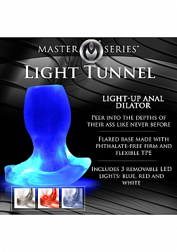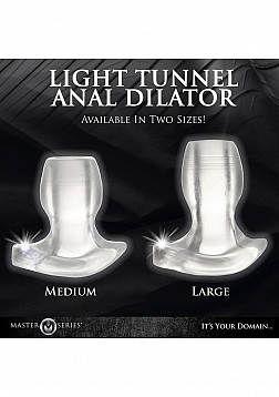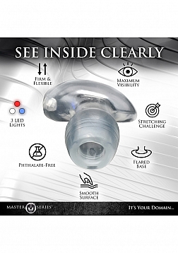 You're gonna love what's at the end of this tunnel of light! With this light-up anal dilator, you can illuminate the clear TPE material and see inside that gaping hole as you play! This firm and flexible dilator squeezes inside experienced derrieres for a full feeling that still allows for a sturdy tunnel that you can insert other things into to get deeper inside or enjoy the gaping view! Choose between 3 different color LED lights -blue, red or white- to enjoy adding something special as you look deeper inside! The flared base makes sure it doesn't slip too far inside and makes it safe to wear for longer periods. To clean it, remove the LED light and wash with warm water and mild soap, then rinse it off and spray with a toy cleaner before drying with a soft towel and storing in a cool, dark place. Use only with water-based or silicone-based lubricants for best results.
