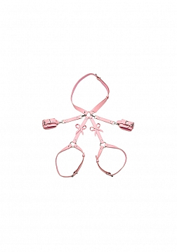 Beautiful Bondage: Enjoy how this harness restrains your waist, thighs and wrists with straps and wrist-cuffs. Added to the design are little bows that accent the backs of your thighs!