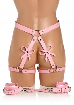 <h3>Key Features:</h3> <li>Beautiful Bondage: Enjoy how this harness restrains your waist, thighs and wrists with straps and wrist-cuffs. Added to the design are little bows that accent the backs of your thighs!</li> <li>PU Leather: Made out of vegan-friendly, durable, PU faux leather. Spot clean as needed.</li> <li>Adjustable Buckles: All straps are adjustable via the buckles and holes.</li> <li>Nickel-Free Metal: Metal used is nickel-free and body-safe.</li>