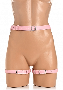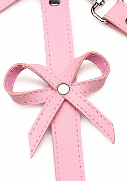 The use of your body is a gift; treat it like one with this bondage harness and wrap up your waist, thighs and wrists like a nice, little package -it even has bows included! Made out of pink, durable PU faux leather, it is vegan friendly and easy to spot clean or wipe clean after each use. The wrist cuffs close using nickel-free, silver colored metal buckles. Adjust the buckles on the thigh straps, waist strap and wrist cuffs for a custom and comfortable fit. Accentuate your curves and make your partner drool with lust and desire as you present yourself as the object of their admiration, a bound and submissive playmate ready to spice up the night!
