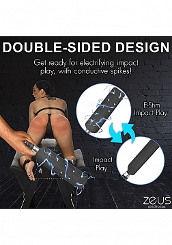 Add some bite to your spanking sessions with this E-stim Spiked Paddle! It has 10 spikes on one side that will bite into your partner's juicy flesh like little teeth. They won't break the skin, but they will leave a memorable sensation. Flip it over to the flat side and rub their behind to cool them down. Then amp up the intensity again by turning on the electrostimulation! Choose between two different intensities and enjoy as they get shocked by the conductive spikes! The paddle is covered in vegan-friendly, faux (PU) leather and the metal is made out of nickel-free, zinc alloy. The e-stim paddle is rechargeable. Simply use the USB cable provided. Keep away from water.