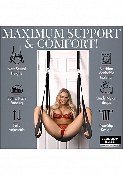 Key Features: Easy to Set Up: Easily hook it over a doorframe or clip it into a sex swing stand. Adjustable Straps: The seat pads, thighs pads and hand grips are all adjustable for a custom, comfortable position. Strong and Durable: This durable nylon can handle up to 300 lbs of weight so you can feel safe and secure while suspended. Padded for Comfort: The straps are padded around the seat area and thighs so you can relax and enjoy the ride without nylon biting into your skin!