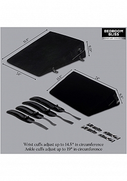 Measurements: Small cushion: 13.5 inches Length x 24 inches Width x 6.5 inches Height Large cushion: 31.5 inches Length x 24 inches Width x 9.25 inches Height Wrist cuffs adjust up to 14.5 inches in circumference. Ankle cuffs adjust up to 19 inches in circumference.