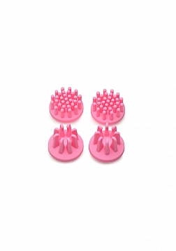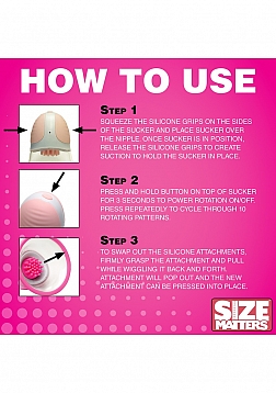 Squeeze the silicone grips on the sides of the sucker and place the sucker over the nipple. Once the sucker is in position, release the silicone grips to create suction to hold the sucker in place. Press and hold the button on top of the sucker for 3 seconds to power rotation on/off. Press repeatedly to cycle through 10 rotating patterns. To swap out the silicone attachments, firmly grasp the attachment and pull while wiggling it back and forth. Attachment will pop out and the new attachment can be pressed into place.