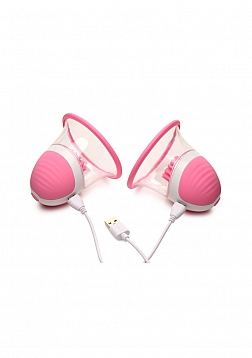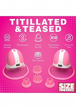 For those who want to expand the potential for arousal from nipple stimulation, or for those who love constant attention on their nipples and areolas, these rotating silicone nipple suckers are for you! Each of the cups holds on via suction so they are hands-free! Once on, press the button and enjoy the premium, phthalate-free, silky smooth silicone as it rotates across and around your nipples! Comes with a set of two different attachments. One of the attachments has longer, thin nubs that go around the nipple and stimulate the sides of the nipple and the areola. The other set has shorter nubs that stimulate the top of the nipple directly. Rated as IPX5 waterproof, it is splashproof and can handle low pressure jets. Do not submerge under water. Use only with water-based lubricants. To recharge, use the USB charging cable provided.