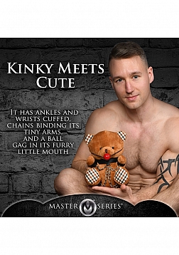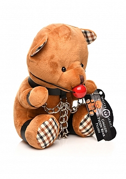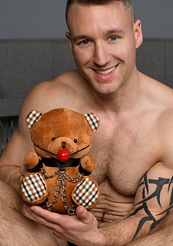 Give this gagged bear as a gag gift or keep it for yourself! It's just big enough to cuddle but doesn't take up too much space! Add it to your collection for Littles to play with, give it to your submissive during aftercare, or keep it with your pillows! With a collar, wrist and ankle cuffs and nickel-free chains connecting them, this little bear is restrained for your pleasure and amusement! Made out of polyester, PU faux leather, plastic and nickel-free metal.