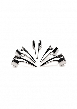 Dig into pleasure with this 5 piece Claw Ring set! The sturdy, stainless steel gives you long claws on one hand to scratch, caress, claw and stimulate your partner with! This set has adjustable rings for a comfortable and secure fit for anyone. The stainless steel is nickel-free for sensitive skin and also non-porous so it is easy to clean and can be exposed to any lubricant type. Have some fun with e-stim and combine it with a body adapter electrostimulation plate! Run your fingers over your lover and shock them with a single touch as your body becomes conductive and the current runs through you! These make perfect additions to any kinky scene and really add to sensation play! To clean, boil the steel in hot water or simply wash them with warm water and mild soap before spraying them with a toy cleaner. Slip each ring on your fingers and adjust them for tightness. They transform your hand into the hand of a beast with claws! The sinister claws add to your look and add even more to your touch. As you drag them lightly across your partner's body, their skin gets goosebumps with each light caress. As you get to the meat of their thigh you dig in and press the rounded tips into their skin and muscles. A moan escapes their lips and you lean in to bite their neck, adding to the intensity! You release them and then turn on the electrostimulation. Each touch now shocks them and they laugh and scream in pleasure and pain! You continue to play them like an instrument late into the night!