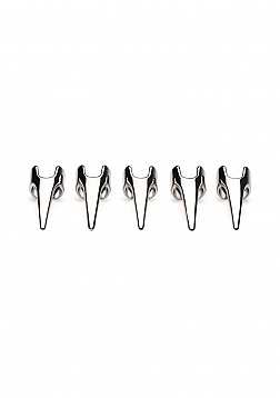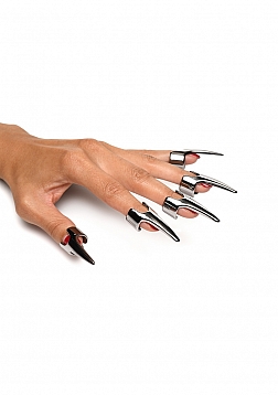 Dig into pleasure with this 5 piece Claw Ring set! The sturdy, stainless steel gives you long claws on one hand to scratch, caress, claw and stimulate your partner with! This set has adjustable rings for a comfortable and secure fit for anyone. The stainless steel is nickel-free for sensitive skin and also non-porous so it is easy to clean and can be exposed to any lubricant type. Have some fun with e-stim and combine it with a body adapter electrostimulation plate! Run your fingers over your lover and shock them with a single touch as your body becomes conductive and the current runs through you! These make perfect additions to any kinky scene and really add to sensation play! To clean, boil the steel in hot water or simply wash them with warm water and mild soap before spraying them with a toy cleaner. Slip each ring on your fingers and adjust them for tightness. They transform your hand into the hand of a beast with claws! The sinister claws add to your look and add even more to your touch. As you drag them lightly across your partner's body, their skin gets goosebumps with each light caress. As you get to the meat of their thigh you dig in and press the rounded tips into their skin and muscles. A moan escapes their lips and you lean in to bite their neck, adding to the intensity! You release them and then turn on the electrostimulation. Each touch now shocks them and they laugh and scream in pleasure and pain! You continue to play them like an instrument late into the night!