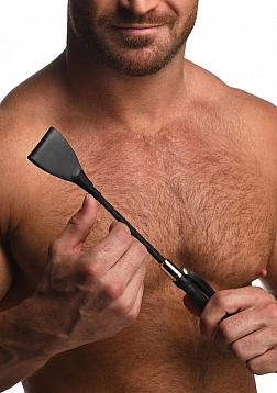 Add a sturdy crop to your collection and always have a wicked tool on hand for spankings and kinky play! This riding crop delivers a sharp and certain bite for when you want to kiss your partner with a touch of delightful pain. Made out of vegan friendly leather, this crop has a textured grip that helps you keep your grip as you play. The firm rod at the center is made of a glass fiber that is firm with enough flex to handle impact. The triangular end is perfect or precise and specific impact play. To clean, spray with a toy cleaner or a mixture of alcohol and water.