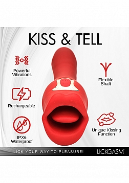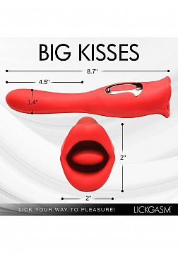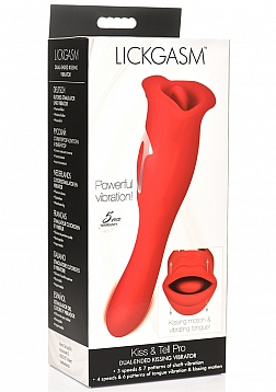 Your deepest kisses await. Satisfy your desires with this dual-ended kissing vibrator! The luscious red Lickgasm has a flexible, vibrating shaft and a kissing, licking mouth. Enjoy 3 speeds and 7 patterns of vibration throughout the shaft and use it to penetrate yourself as much as you crave. Warm up with countless kisses as the kissing tongue gives you 4 speeds and 6 patterns of simultaneous kissing and vibration. Your precious pearl will thank you as the smooth, premium, phthalate-free silicone brushes against your lips for intimate play. Rated as IPX6 waterproof you can take it in the shower but do not submerge it under water. After play, wash with warm water and mild soap, then spray with a toy cleaner and let dry.