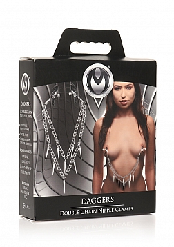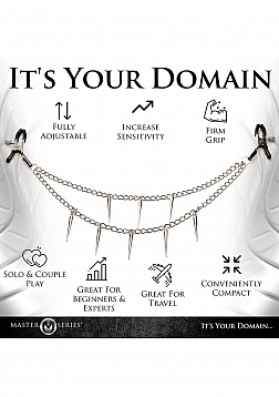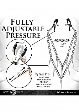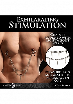Color: Black, silver. Key Features: Spiked Chain: Two rows of chain hang down between the nipples and have spikes dangling from them. Enjoy the aesthetic and look as well as the ability to gently tug at the clamps! Adjustable Clamps: Use the screw to adjust for perfect pressure and position. Rubber Coated Tips: Protect the sensitive skin of the nipple and areola with the rubber tipped ends. Nickel-Free Metal: All metal is nickel-free for sensitive bodies.