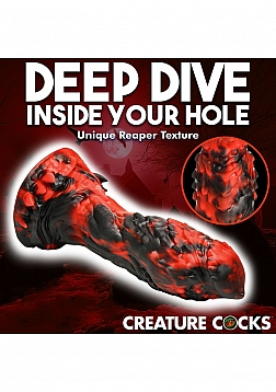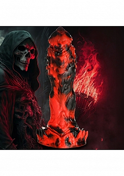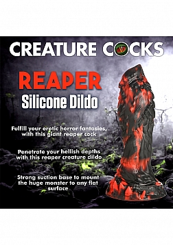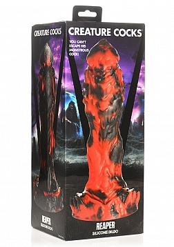 The Reaper comes for more than just your soul! It comes for your hole, too! This red and black dildo is menacingly large with textured ridges, nubs, grooves and spikes on it. The edge of the corona is rimmed with spiked nubs and is wider at the top then the middle. Made out of premium, flexible, phthalate-free silicone, this dong is body-safe and best used with water-based lubricants only. Enjoy hands free rides due to the strong suction cup base! Invite a partner to indulge in kinky cosplay or fantasy roleplay and use their favorite harness to transform this dong into a strapon! Afterward, make sure to wash it with warm water and mild soap, then spray it with a toy cleaner and air-dry. Keep out of direct sunlight and heat.