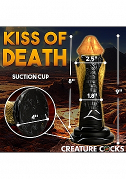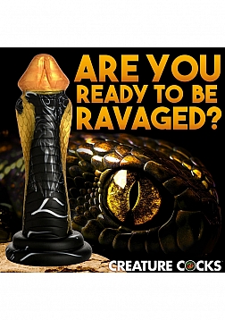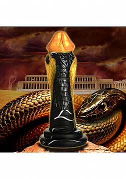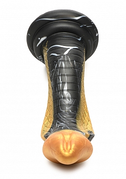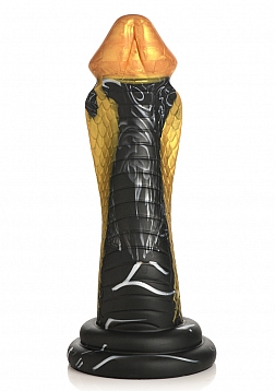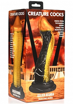 The royal king of cobras, the Golden Snake of your dreams has arrived! The brilliant, shining gold and black body has an exaggerated S-curve that will hit your G-spot or P-spot. The wide hood at the top stretches you open and adds extra, soft and scaly texture while the round, dong-shaped head slides easily inside. Made out of premium, flexible, phthalate-free silicone, this dong is body-safe and best used with water-based lubricants only. Enjoy hands free rides due to the strong suction cup base! Invite a partner to indulge in kinky cosplay or fantasy roleplay and use their favorite harness to transform this dong into a strapon! Afterward, make sure to wash it with warm water and mild soap, then spray it with a toy cleaner and air-dry. Keep out of direct sunlight and heat. In the dim firelight you catch the glinting shimmer of gold. It's known that there are snakes in these parts, but you had to find shelter somehow in the warm desert. This cave was perfect to shelter you for the night so you built a fire and watched the light while it sparked to life. As you listen to the crackles, you hear a soft scraping across the dusty floor and catch sight of something gold. A snake rises up, brilliant and large, swaying slightly. It seems hypnotized by the firelight! That's when you notice that, besides its large size, it has a peculiar shaped head! It's almost as if